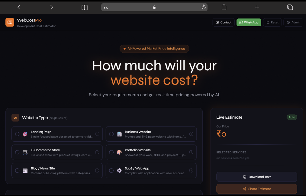 Website Development Cost Estimator Pro With AI is a powerful and ready-to-use web application template designed to help agencies, freelancers, and businesses instantly estimate website development costs based on user inputs. This smart estimator not only provides transparent pricing but also helps capture valuable leads from potential clients
